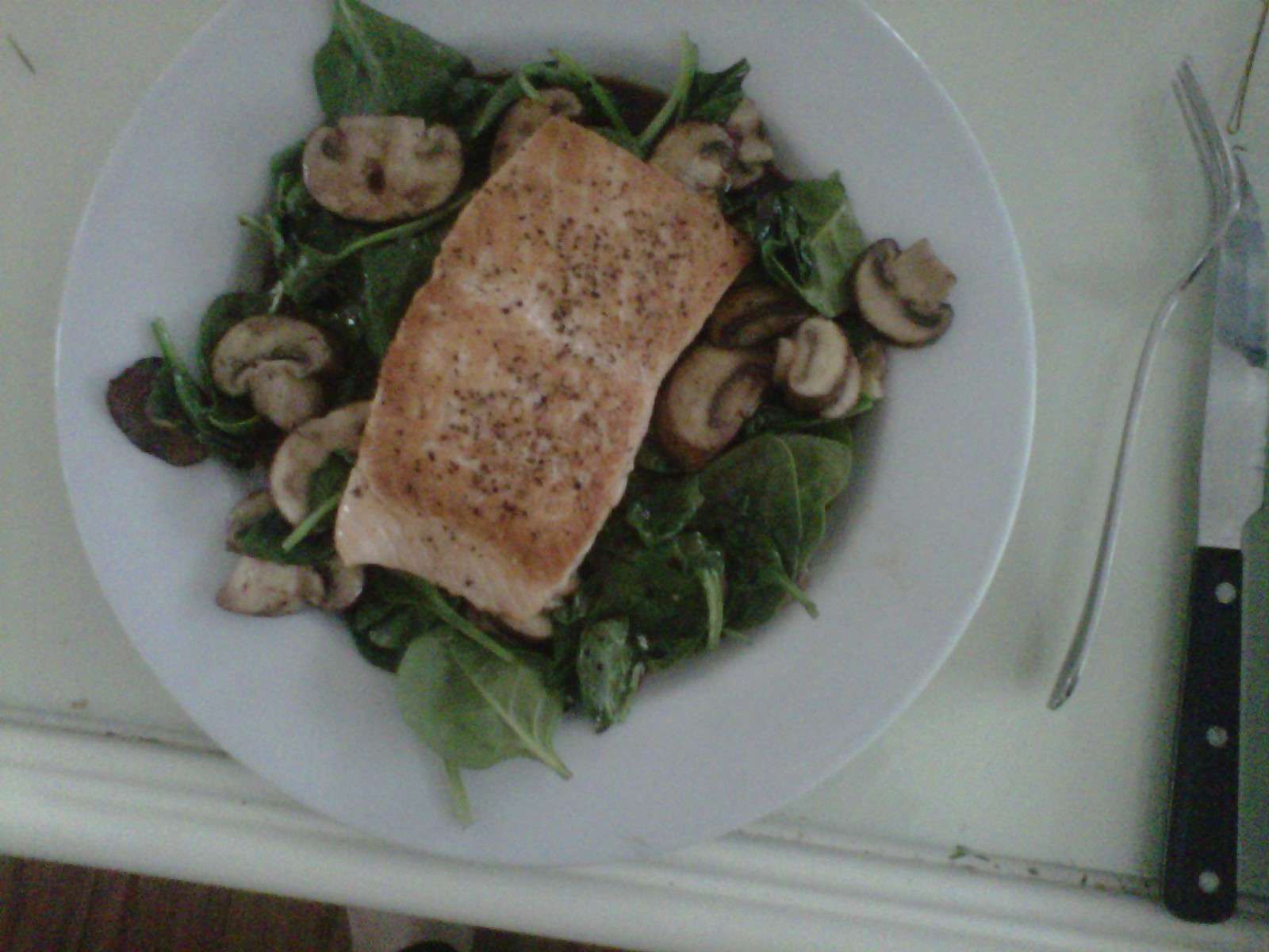Yummy salmon with sauteed crimini mushroons, wilted spinach and aged balsamic